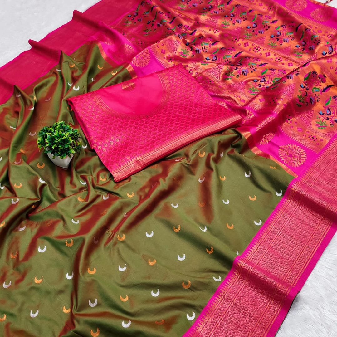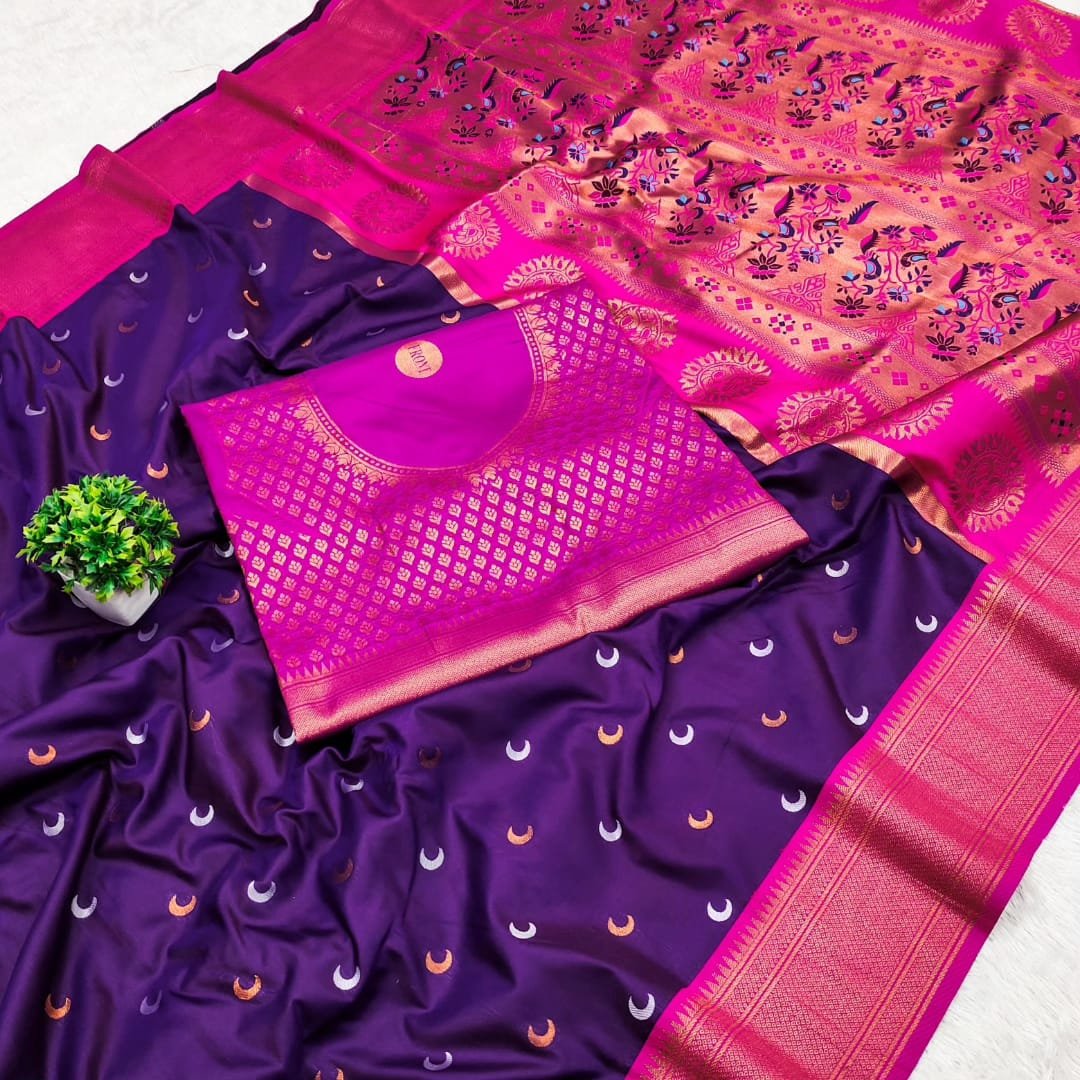 Saree :- Soft Pethani silk saree with Gold & silver zari weawing moon design and Meenakari weawing Rich 🦚 pallu with traditional paithani border & Tessel attached at Pallu end.